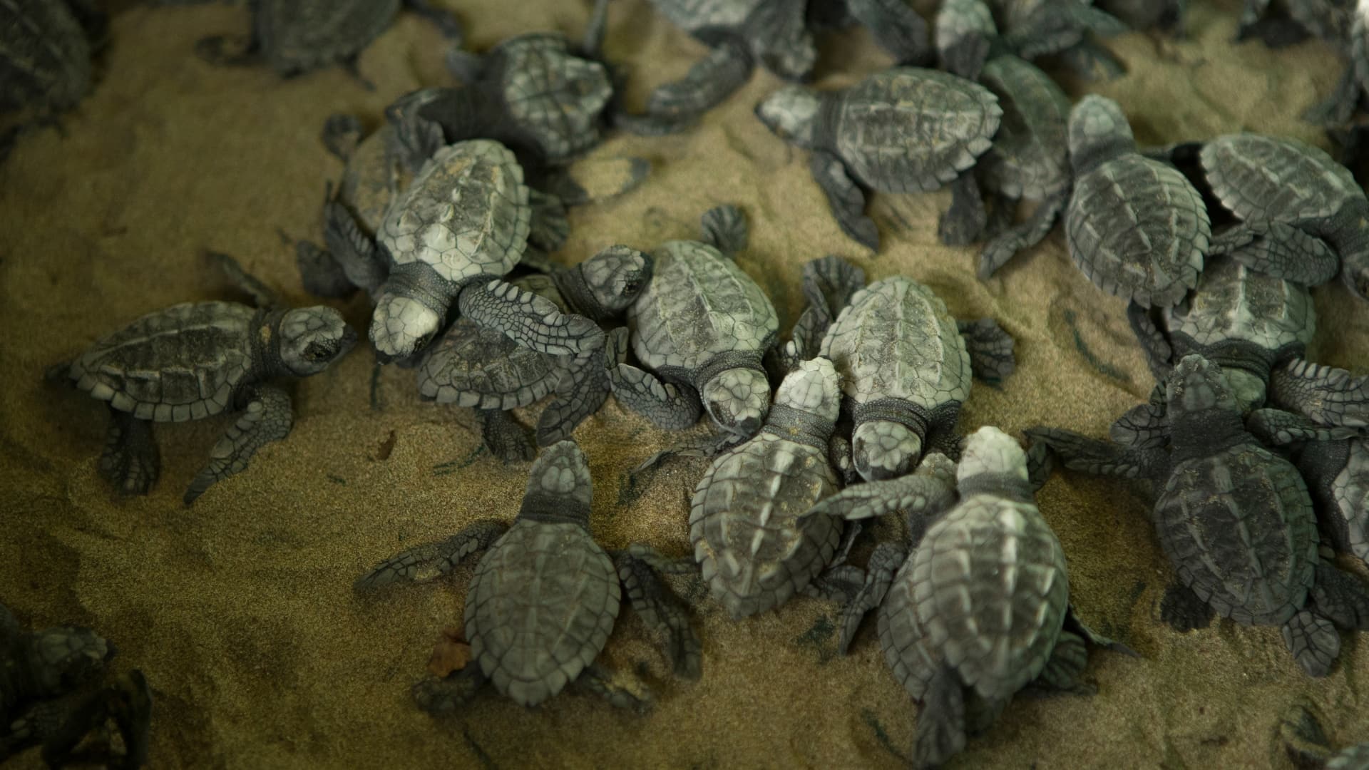 Olive ridley turtles follow specific nesting patterns influenced by lunar cycles and tides, typically coming ashore during high tide. Nesting activity often begins with small numbers, peaks, and then gradually declines, usually between November and March.
